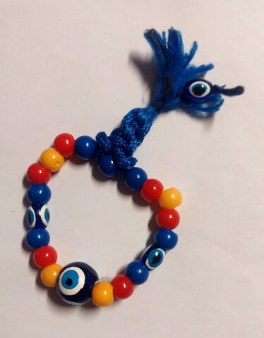 Pirmajā Erasmus nedēļā Turcijā aizgāju uz tirgu un jau pamanīju iespēju taisīt vēl kandi. Tur bija kaklarotas(?), laikam paredzētas lopiem, no diezgan lēta izskata plastmasas pērlītēm, kas savērtas uz polietilēna virvītes. Nopirku vienu un pārtaisīju to pa savam ar vēl citur atrastām pērlītēm un zilu striķi, kas bija paņēmies līdzi.